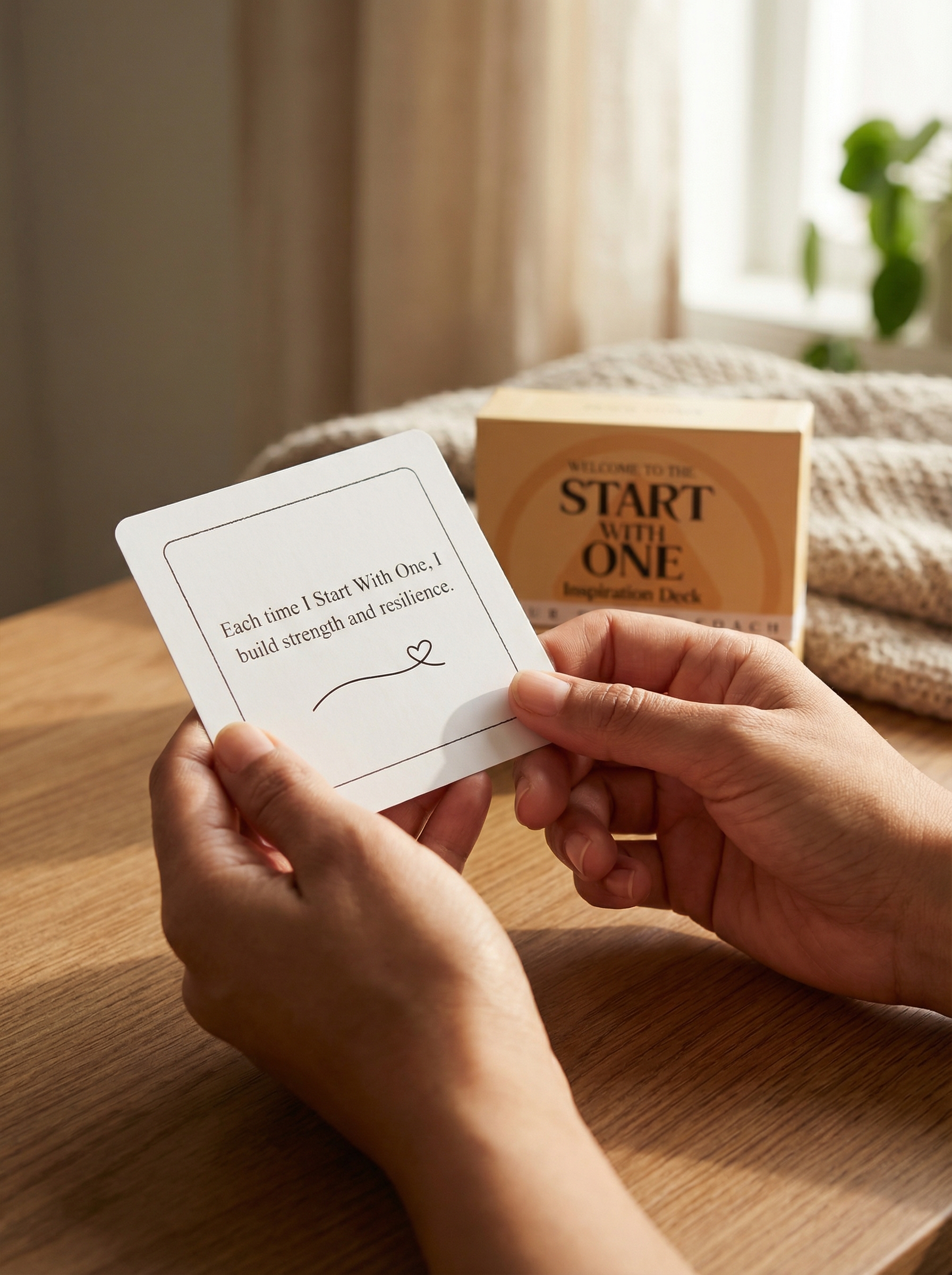 Find clarity, calm, and momentum — one mindful card at a time. The Start With One Inspiration Deck supports gentle, meaningful change without pressure or perfection.